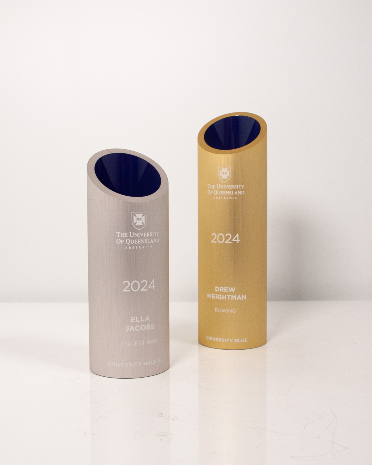 Custom shaped metal cylindrical trophies with brushed finish